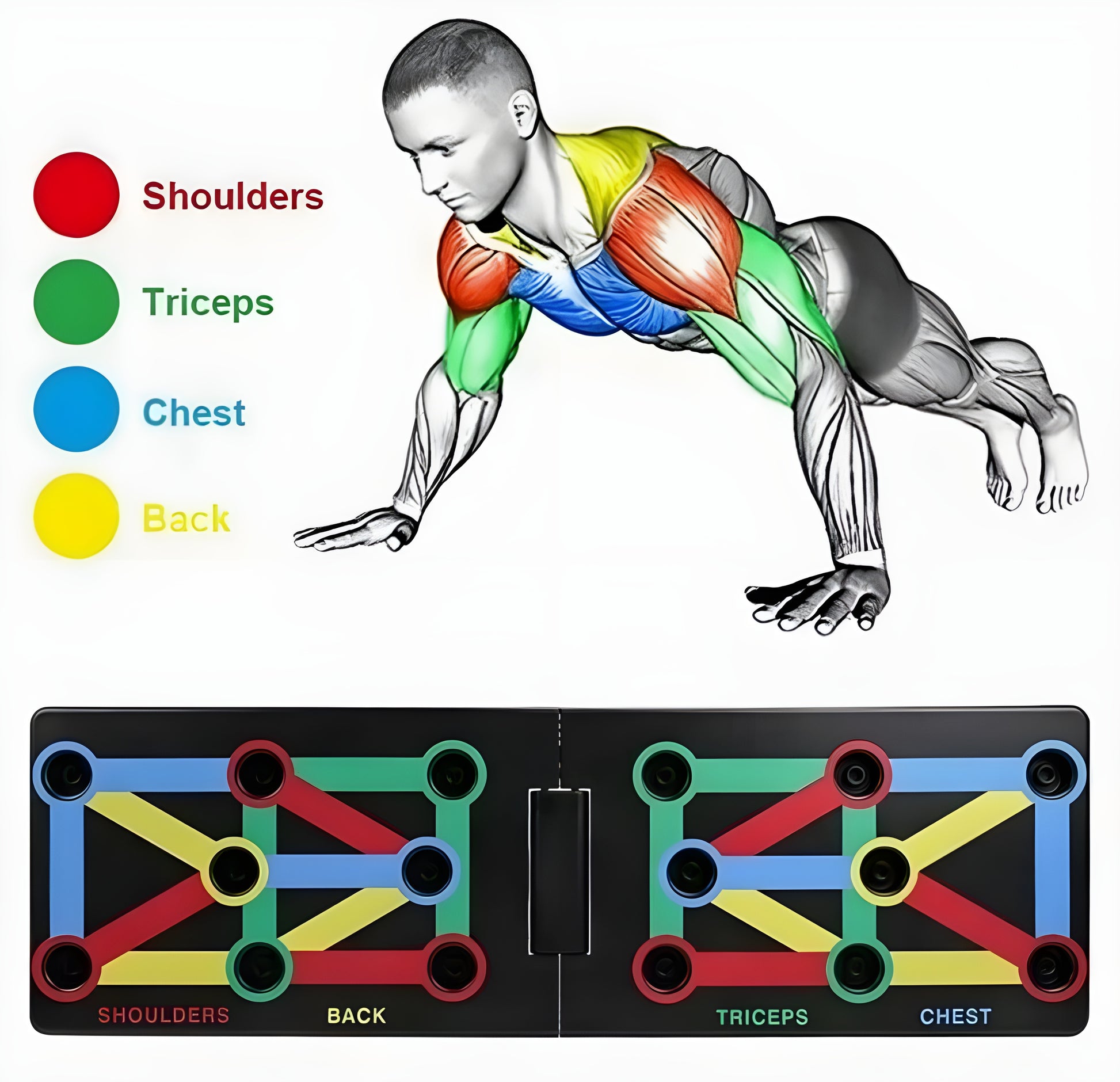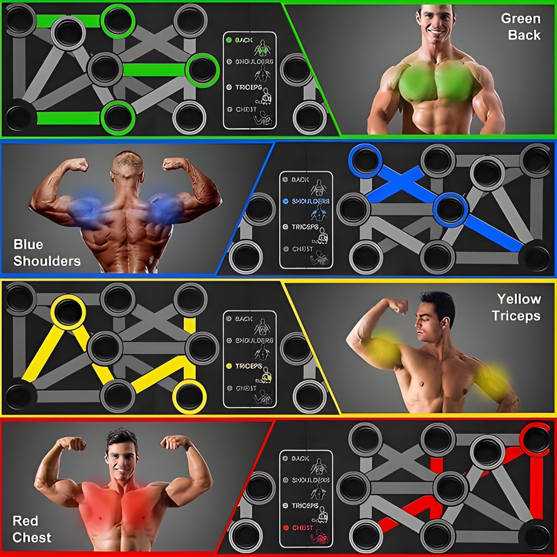 Vielseitiges Training: Dank der Farbkodierung kannst du gezielt Muskelgruppen wie Brust, Arme, Schultern und Rücken trainieren.